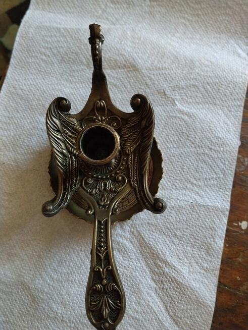 SPRZEDAM: Świecznik mosiężny w kształcie pawia Stan taki jak na zdjęciach Świecznik jest pomalowany, farba ...